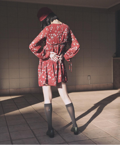 復古碎花洋裝搭配長筒襪,穿出帶點個性的甜美look。