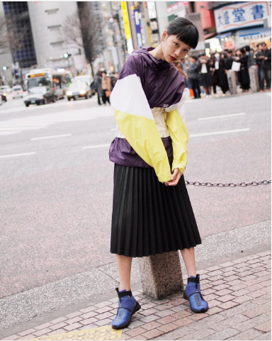 鮮豔的運動服搭配黑色百褶裙,再把頭髮紮起,休閒俐落的造型就完成了。