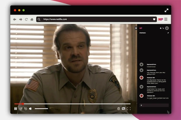 將「Netflix Party」載下來之後,只要開啟Netflix,並在播放影片的時點選擴充功能的「NP」的字樣,將顯示的URL網址分享給朋友後,他就可以憑網址進入同步畫面,聊天室也會隨之開啟,就能開始聊天了!操作十分簡單!