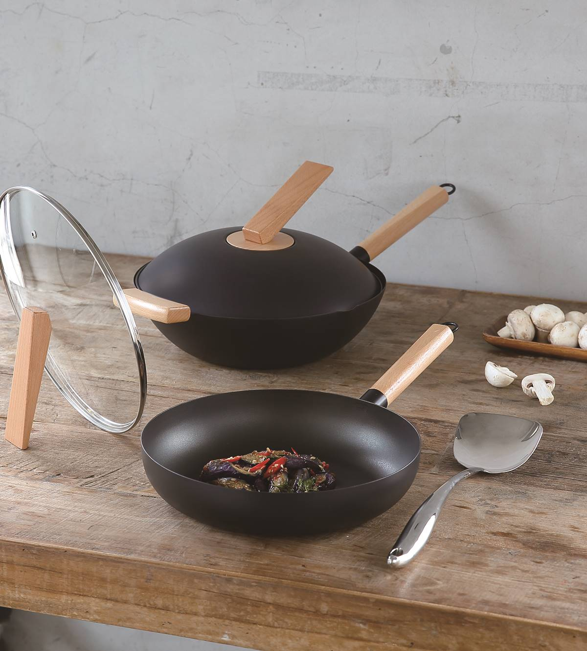 廚房新手炒菜時,最怕掀蓋那一刻,眼前整鍋滾燙高溫,鍋蓋不知往哪擺?HOLA炙鐵鍋系列的鍋蓋,採高腳椅型把手設計,並以溫潤木質取代冰冷的金屬材質,不怕燙手,且可優雅穩固直立擺放。