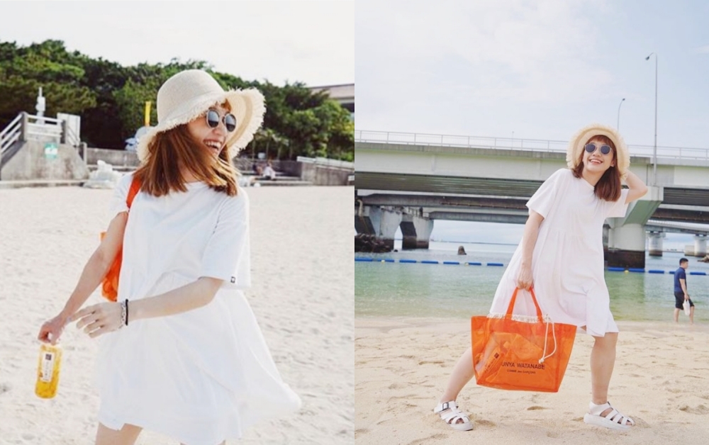 Lulu在沖繩的海邊穿的這款寬鬆連身裙搭配起來真的好陽光~而且這款設計會讓穿上的人看起來更減齡,活潑少女感瞬間UP!簡單的裙子可以搭配一些單品來添加造型的特點,像Lulu一樣搭配草帽和亮色包包,馬上變成海邊最歡樂的girl!(海邊就是讓人心情好!)