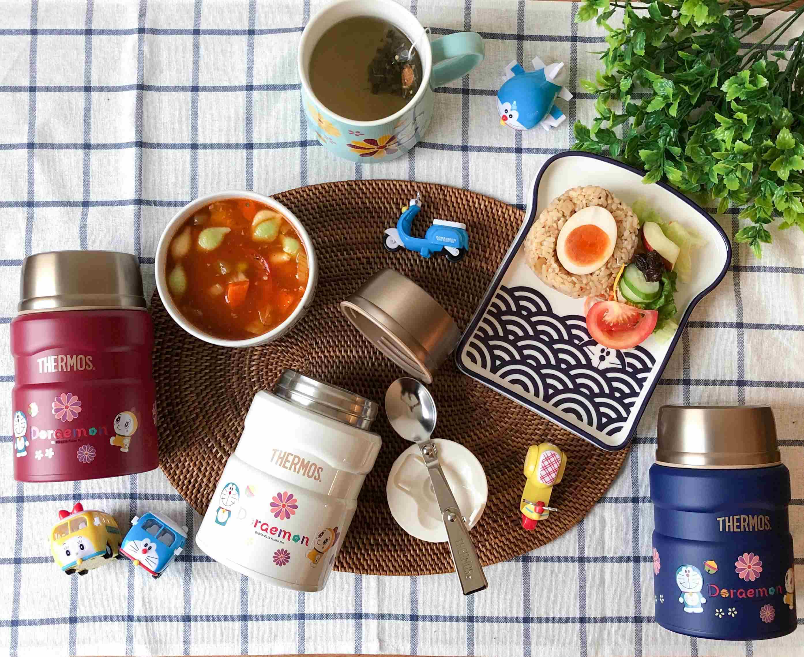 還有限量的「膳魔師不銹鋼真空食物燜燒罐」,共三款不同顏色,上面有著可愛的哆啦A夢的圖案,不只能保溫還能保冷,蓋子還附上一支折疊湯匙,搭配上第一波的陶瓷盤、咖啡沖泡壺,就可以帶出門野餐囉!
