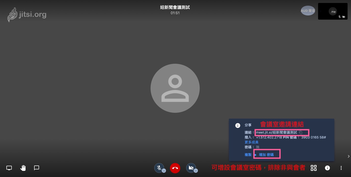 Step3:成功啟動會議後,右下方有個「i」可設定會議室密碼,也可邀請他人進入會議室,其方法包括會議室連結網址、電話撥入等。