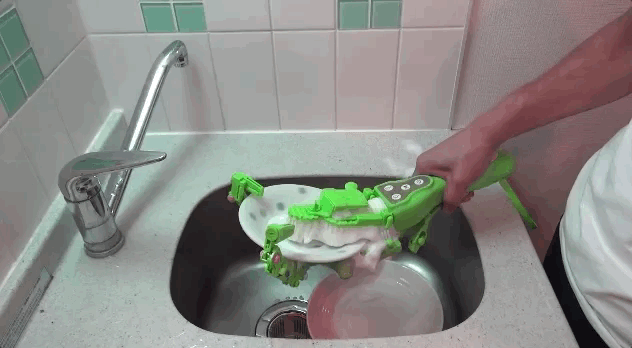 如影片所示,只要把碗盤固定在這個長得像螳螂或鱷魚的洗碗器上,再按下開關,它就會自動旋轉碗盤,同時用牙齒刷子進行洗刷的動作,過程僅需3到10秒,就能洗淨碗盤。