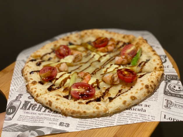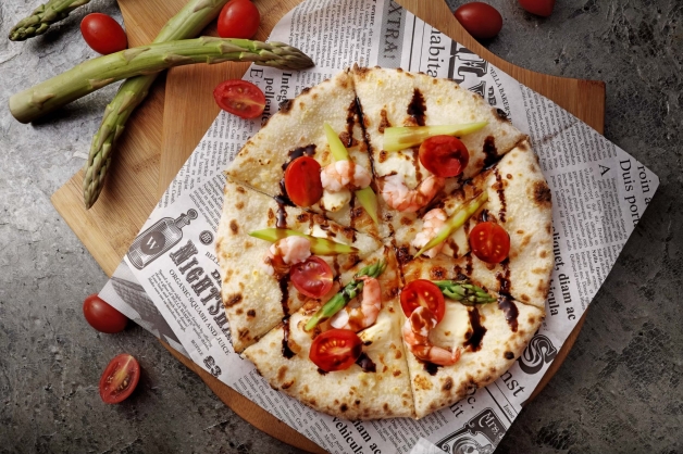 「蘆筍鮮蝦起司披薩」以馬斯卡彭起司為基底,上面放上Q彈鮮蝦和爽脆蘆筍,佐以巴撒米可醋,最後撒上「帕瑪森起士」增添濃郁香氣,在巴撒米可醋的加持下,酸香不膩,口感豐富又多元!