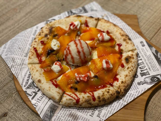 最後則是「新鮮芒果冰淇淋披薩」,以「台灣愛文芒果」為主角,放入「馬斯卡彭起司」增添風味,隨著披薩熱度散開後,香草冰淇淋漸漸融化,再搭配酸甜的覆盆子醬,整體吃起來酸甜交織,絕對是夏季甜披薩代表!