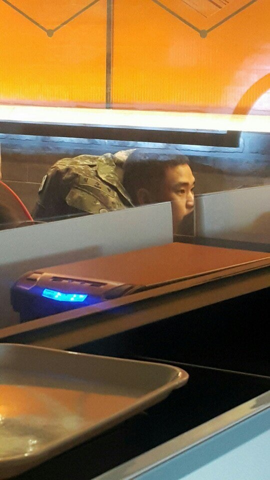 網友PO出的照片中,可以發現金秀賢輕鬆的把軍服披在椅背上,全面集中於電腦螢幕,就是個百分百投入的網癮少年,但是高顏值還是被這位幸運的偶運路人一眼認出!(羨慕~)