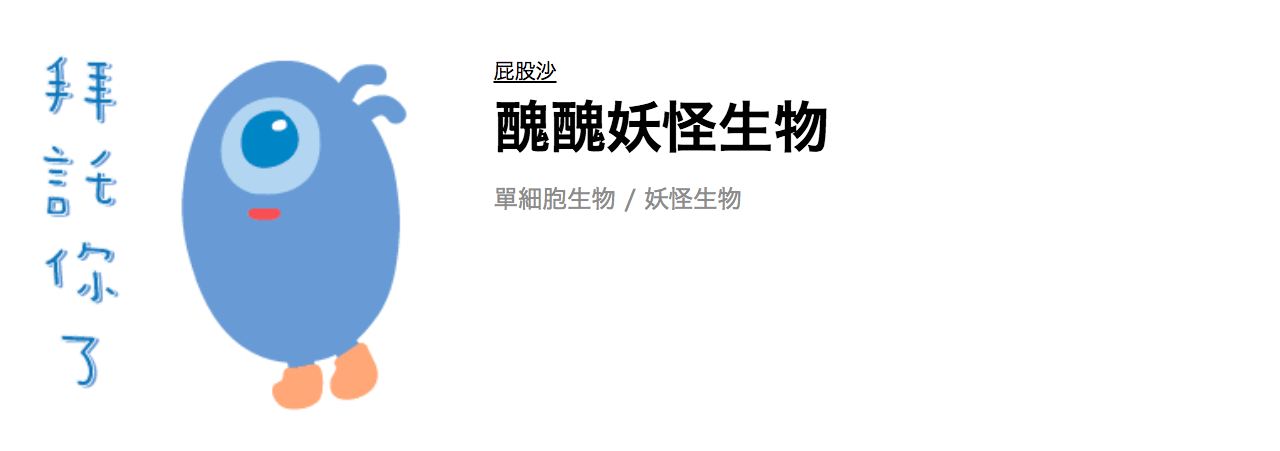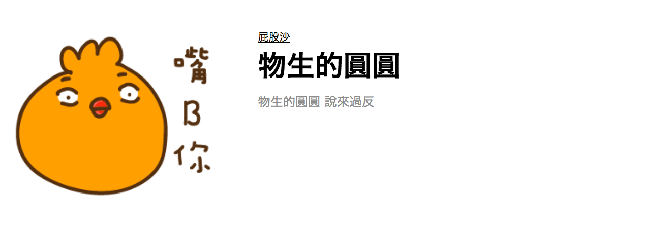 自從把《疊字生物》系列全部包回家之後,Line好像就默認手機小姐是屁股沙的忠實粉絲,只要作者一出新貼圖就會收到通知。感謝Line的貼心提醒,手機小姐發現他最近又生出2款新物種,不得不說屁股沙貼圖上架的速度也太快惹~一直有新物種誕生,而且完全無法預測,到底作者腦袋裡都裝了什麼?!