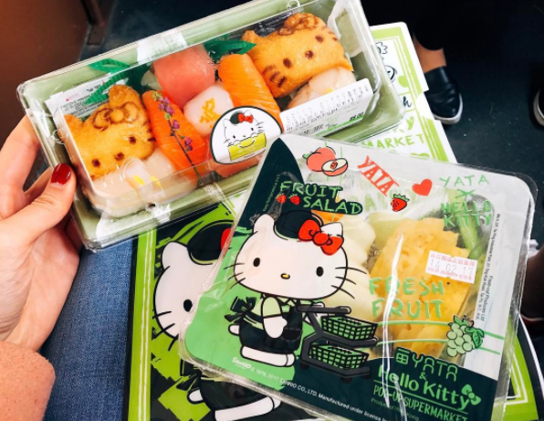 超市中的各種陳設、推車提籃、購物提袋,店員身上穿的圍裙,還有販售的水果、壽司、冰棒、零食…,通通都能看到Hello Kitty的蹤影。