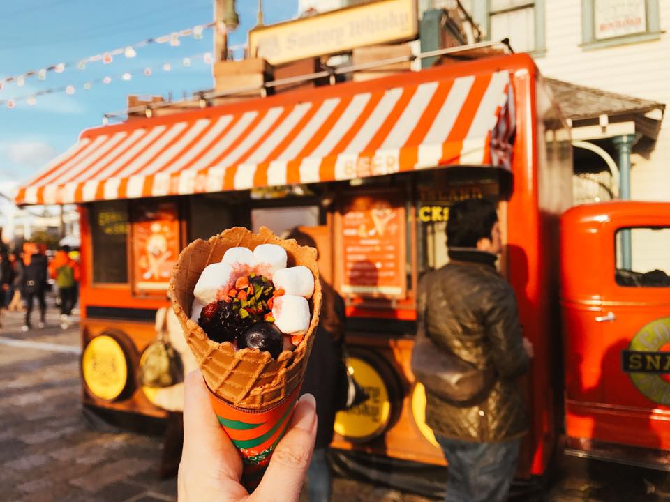 此外聖誕期間,園內還特地推出「聖誕節市集」,有大型貨車在現場販售美味的聖誕餐點。其中一台販售著吃了會暖呼呼的莓果巧克力熱甜筒,濃郁的巧克力醬與滿滿的棉花糖混搭吃下超~幸福。
