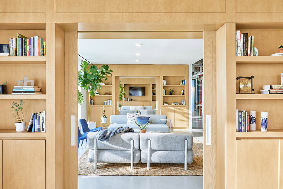 一進門,穿過櫃檯後,看到寬敞的接待區,還有一個開放式的吧台,除了用來接待訪客,也是同事們彼此交流、聊天的區域。兩側則分別是辦公區域以及會議室、沙發區等,完全沒有牆面會擋住視線,寬闊的視野,看得特別心曠神怡。