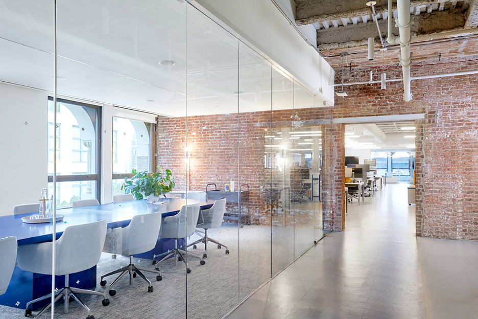 辦公室裡用了許多藍色調的元素,包括辦公椅、沙發、會議長桌、櫥櫃等,既呼應了Casper著名地鐵廣告的顏色,也給人一種放鬆、寧靜的感覺。搭配原木色調的傢俱、紅色磚牆等,整體氛圍真的就像「家」一樣溫馨又舒服。