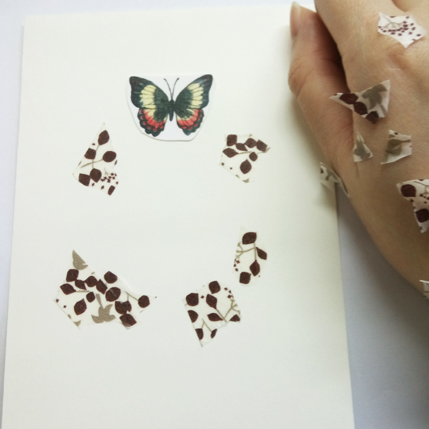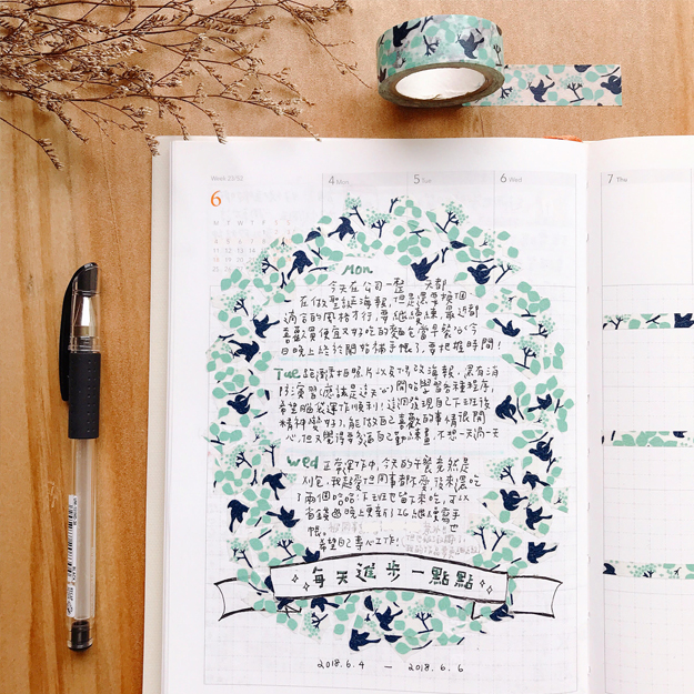 使用花色較密的紙膠帶,沒有全部貼很滿,而是呈現有鬆有密彷彿花叢的感覺,最後把小生物點綴在旁邊。