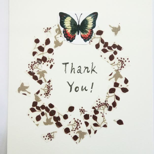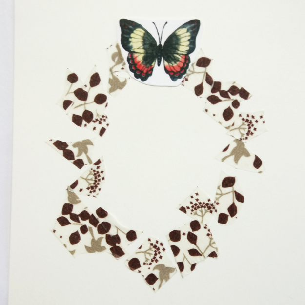 偶爾也會把一兩個小圖案(例如鳥或花瓣)貼在離框遠一點的地方,會製造出生動感。最後寫上內容或祝福語,花框就完成啦!