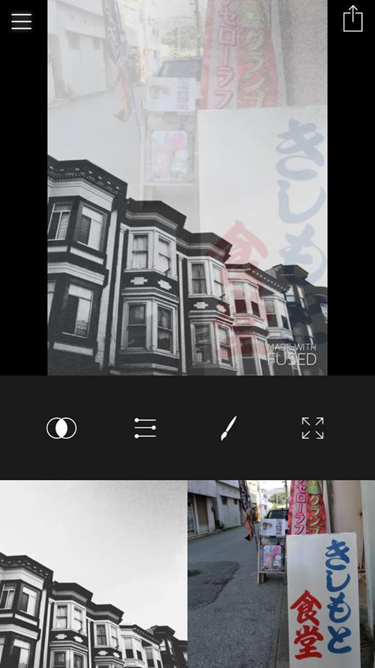 選完背景後,就會看到「Tap To Choose Foreground 」的選項啦~點進去後就能選擇你要的前景,然後可以利用第一個小工具(兩個圈圈相疊的符號)來調整前景的透明度&背景的對比度!接著第二個符號按進去,就可以調整圖片的曝光度,第三個圖示則是用來調整明暗度!全部都調整完畢後,妞妞們就可以按下勾勾把它存到你的手機,發到社群網站上騙讚啦~~~(完全是妞編輯騙讚的好幫手)