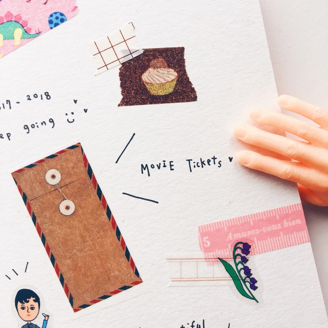 看完電影以後,根據當下的心情,選擇不同的素材來做拼貼,平時買的紙膠帶和貼紙,都可以當作裝飾的好幫手,票根也因此變成更棒的回憶。