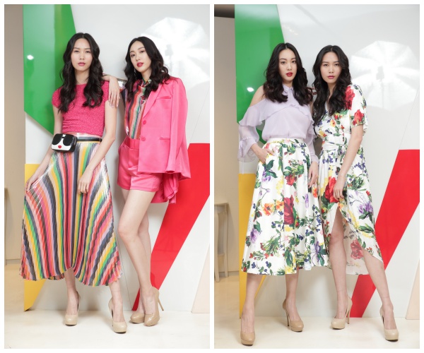 (左)罌粟花紅亮片上衣 NT.20,900、彩虹金屬光澤摺飾裙 NT.28,900、Stace Face 腰包 NT.11,500、罌粟花紅西裝外套 NT.19,500、彩虹金屬光澤襯衫 NT.16,500、罌粟花紅短褲 NT.9,900(右)水彩花卉印花洋裝 NT.19,500、丁香紫削肩上衣 NT.14,500、水彩花卉印花裙 NT.19,500
