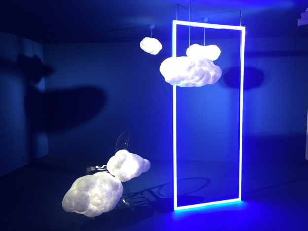 展間中還有許多能夠供參觀者拍照的佈置,像是藍色房間有著雲朵裝飾,雲朵中有一把透明的椅子可以坐著拍照,看起來就會像漂浮在空中一樣~