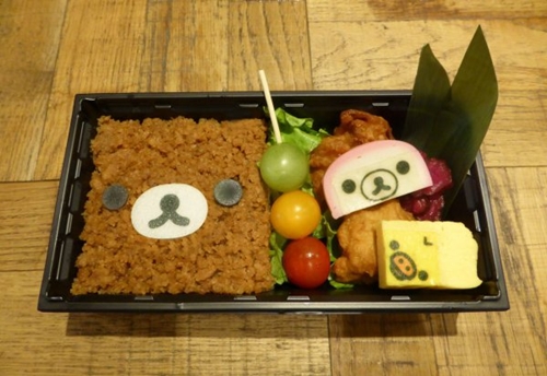 拉拉熊そぼろ便當,そぼろ是由雞絞肉、蛋、和四季豆,這三種必備食材所做成的經典料理,而且這次三色糰子是用番茄做的喔!(小雞玉子燒太Q了~)