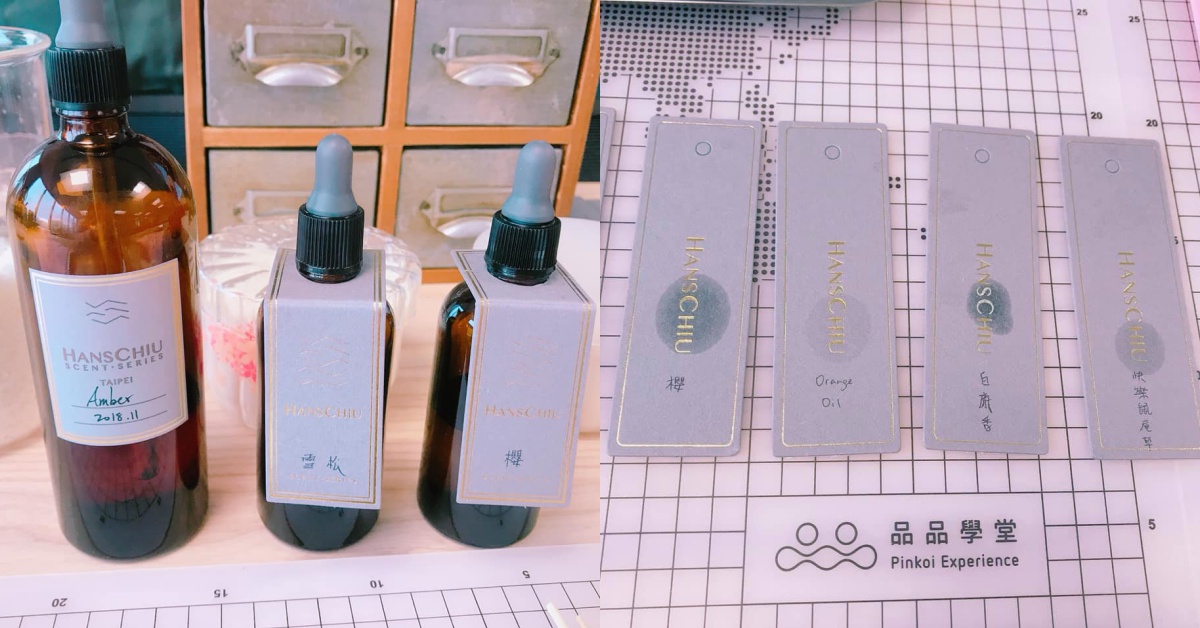 這回妞編輯體驗了兩項手作課程,分別是精油擴香與皮革飾品。「HANSCHIU 瀚思」的設計師Hans,將香氛與蠟燭的玻璃瓶身,打造成浪漫應景的櫻花系列商品。