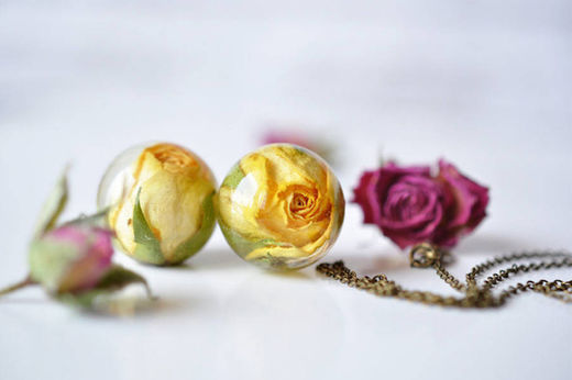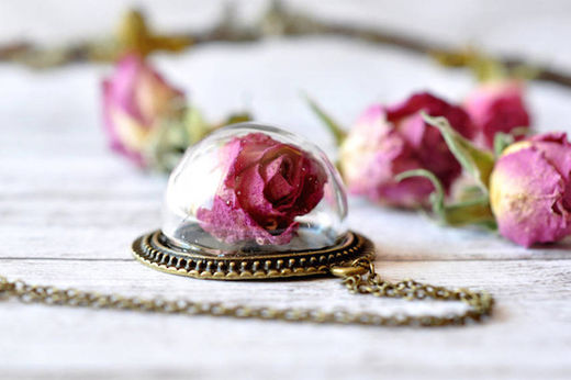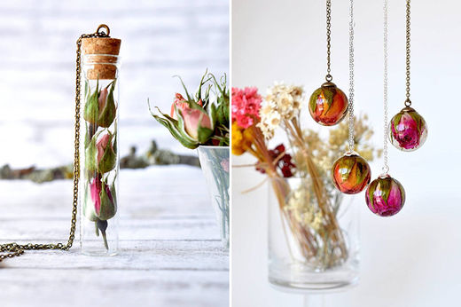 為了彌補這樣浪費的缺憾,藝術家 Paula Schiau 在 Etsy 開設了自己的店鋪,販售她所設計一系列嬌貴卻又蘊含詩意的飾品。Paula 將新鮮的花朵乾燥處理之後,放進小小的玻璃容器中,就像是小心翼翼地珍藏著這朵花,在透明的瓶中永遠美麗。