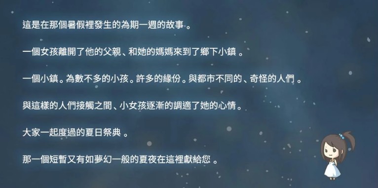 而手機小姐今天要介紹的手遊《昭和盛夏祭典故事~那一天無法忘記的煙火~》講述一位小女孩離開父親後,在祭典時跟許多人接觸,逐漸調適心情的故事。