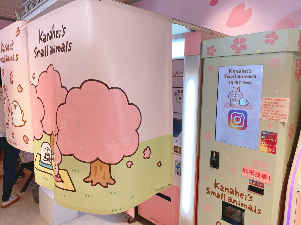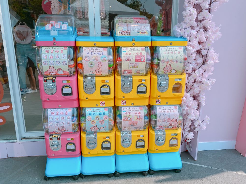 快閃店的外牆以坐在櫻花樹下的兔兔、P助為圖案,每個牆面都超好拍!而正面的粉色鳥居其實是扭蛋機,粉絲可以選擇要向兔兔或P助祈求「吉利籤球」,球內含有一張可兌換獎品的櫻花運勢紙。