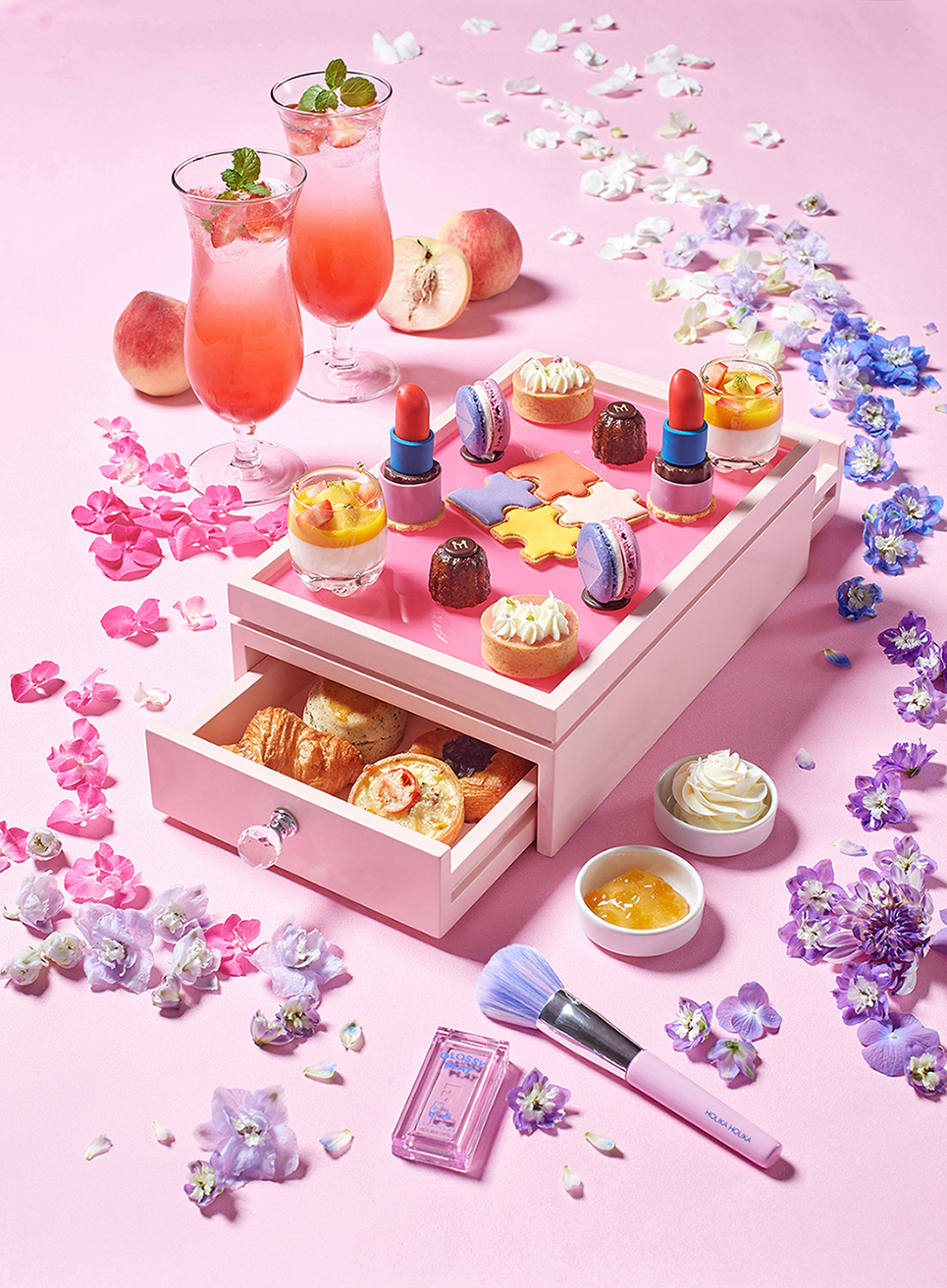 韓系美妝品牌HOLIKA HOLIKA提供近百款彩妝及保養產品,彷彿一座色彩繽紛的美妝樂園,滿足每一位女性愛美的慾望。台北美福大飯店點心房黃伯欽主廚,以HOLIKA HOLIKA今夏最新彩妝系列-GLOSSY PLAY COLLECTION為發想,主打甜而不膩的蜜桃色系彩妝,設計出六款創意甜品及四款經典的鹹品,一次滿足彩妝控與甜點控的俏皮女孩。除了讓女孩們能吃到、拍到美味的甜點外,享受美食完更能把HOLIKA HOLIKA限量腮紅組帶回家!獨特腮紅質地細膩,宛如第二層肌膚般的伏貼於臉頰,搭佐時下流行的蜜桃色系彩妝及毛量豐富的獨家腮紅刷,輕鬆暈染腮紅,讓妳好氣色耀眼滿點!