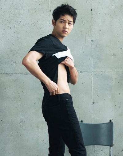 雖然根據宋仲基本人說,肌肉目前已經集體離家出走,所以拍照衣服就只能脫到一半。(我們真的不介意在往上掀一點點,一點點也可以~)