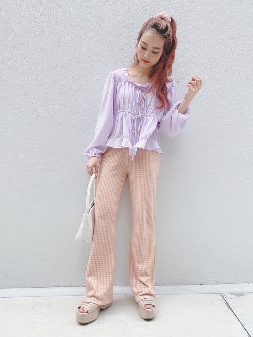 今年可說是紫色大勢的一年,不管是韓國掀起的時尚還是日本令和色的流行,幾乎都脫離不了紫色元素,像是圖中的粉紫抓皺上衣搭配粉橘格紋褲,日系甜美造型直接提升!