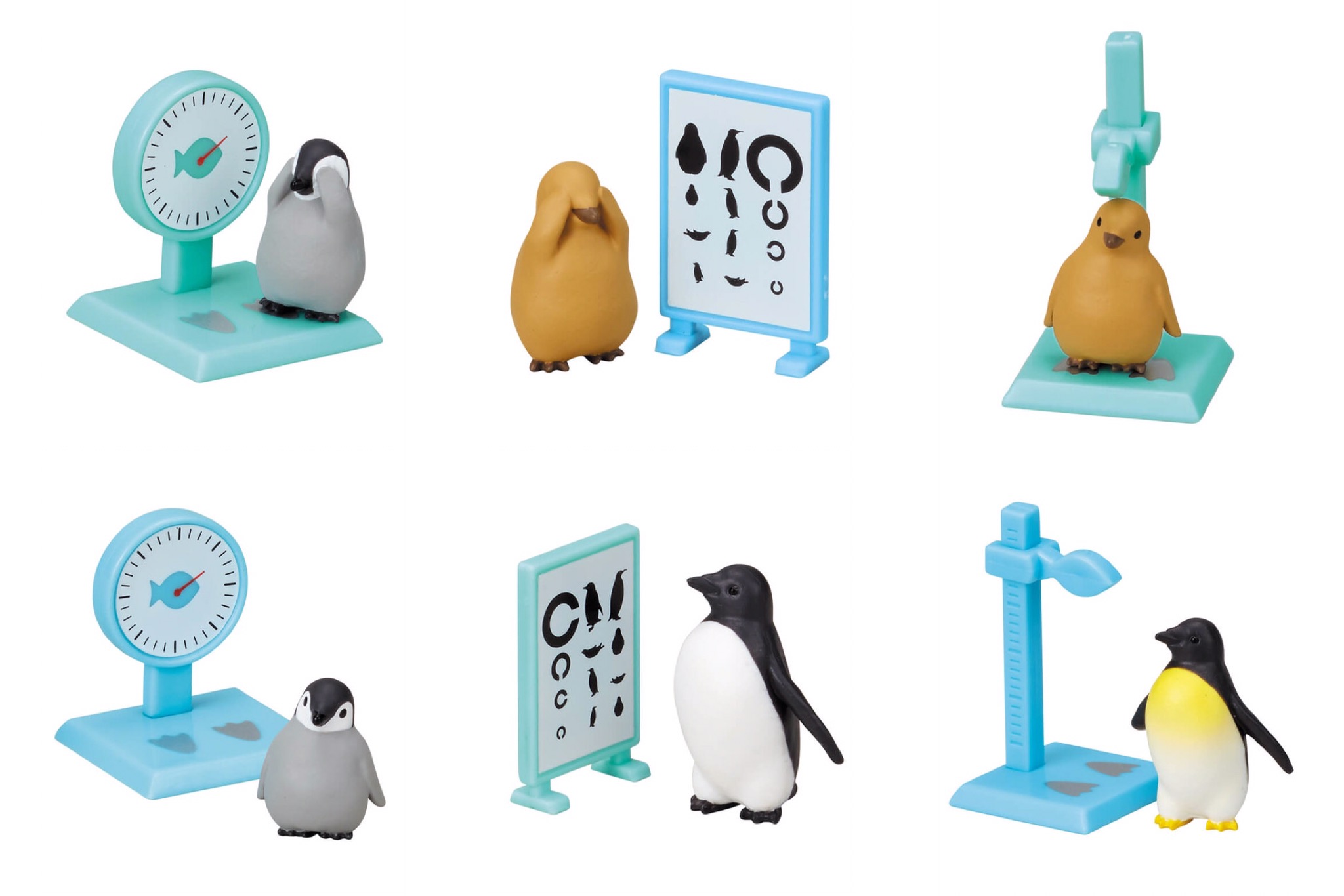 這款扭蛋一共6款,分別為量身高、量體重和測視力三種。各有兩色,藍色和綠色。 搭配不同體型、顏色和動作的小企鵝。量身高的檯子底版有企鵝掌印;體重計背板是小魚;而視力表上還有小企鵝呢!真的好可愛喔!!!