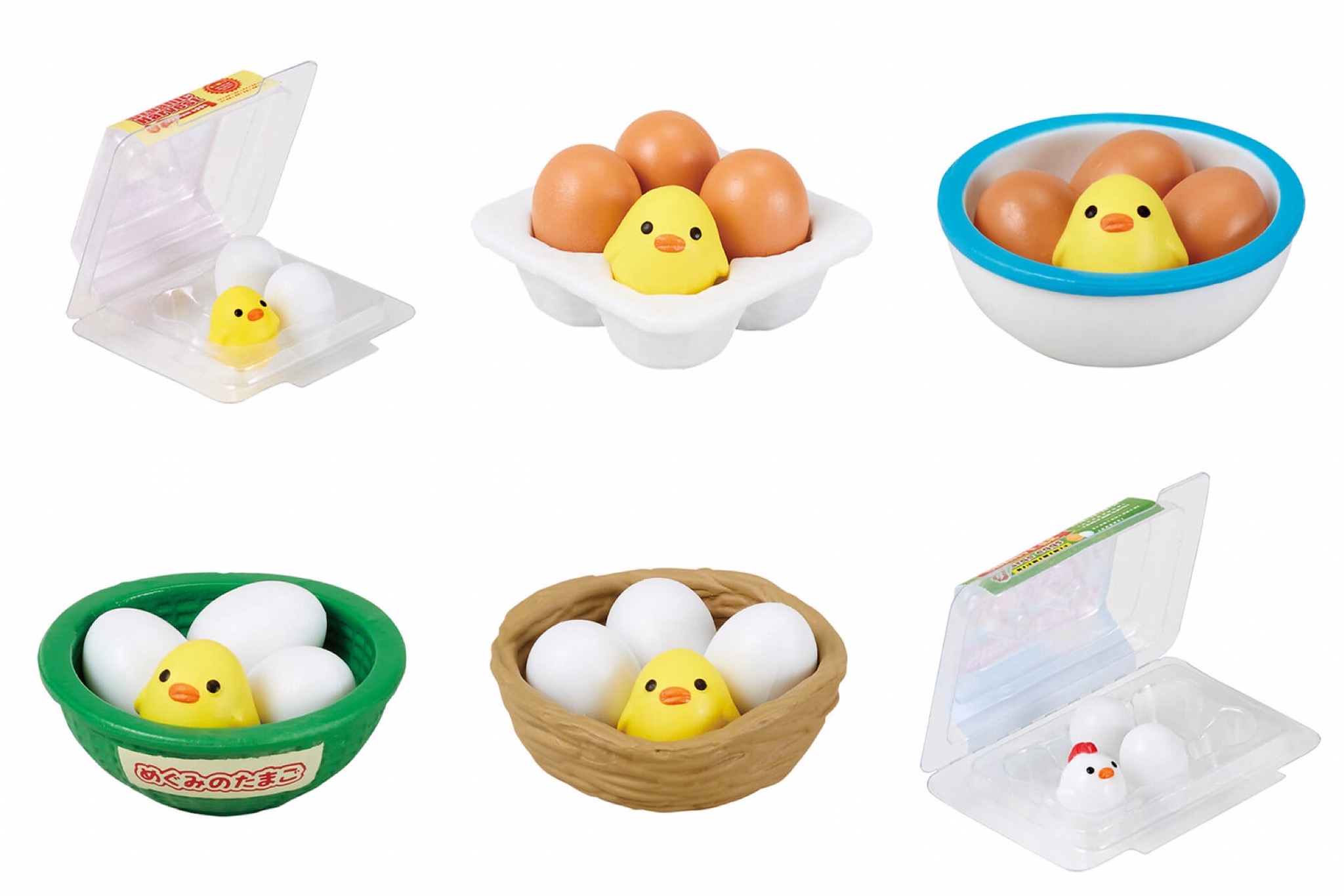 今年八月發售的迷你雞蛋模型,內容包含雞蛋、裝蛋的容器,當然還有我們熟悉的塑膠蛋盒。這組扭蛋一共6款,每一款配置皆為容器和3或4顆蛋。其中,每款皆有一隻有小雞表情,一起擺在透明蛋盒(如下圖5)是不是很可愛呢!