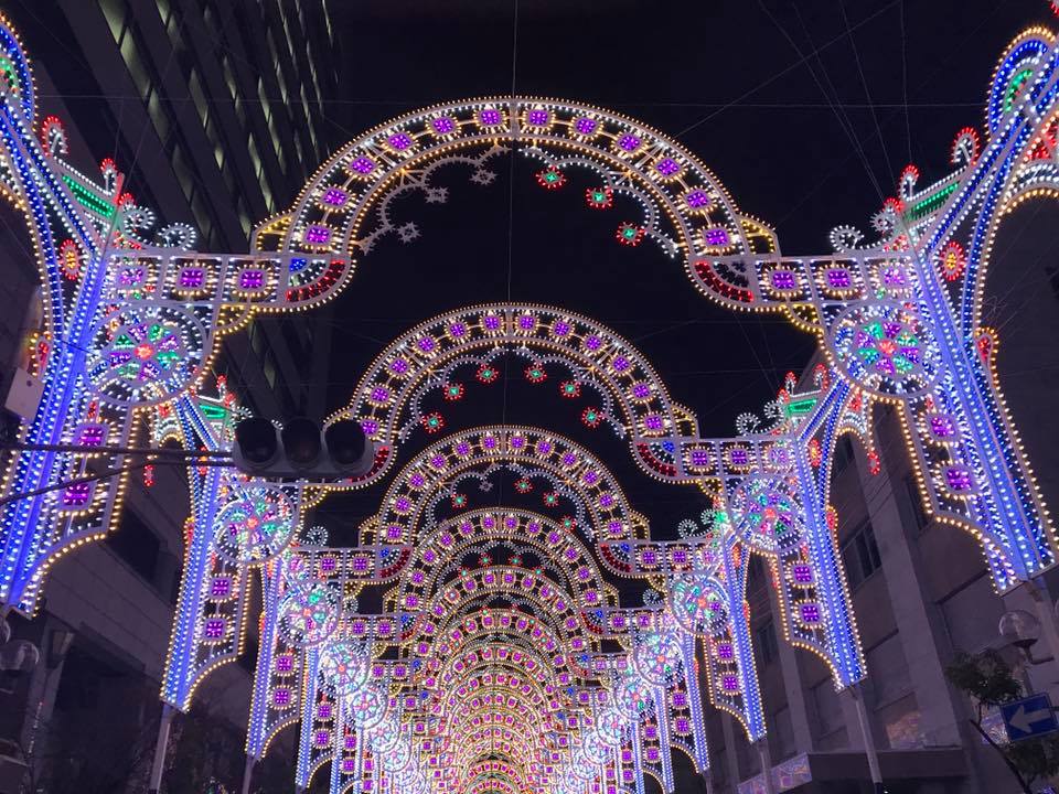 首先在等待時,老早就已有不少從各地前來的旅客卡位了,當鐘聲響起、眼前的燈瞬間點亮那一刻,全場民眾都發出了讚嘆的驚呼聲!本次的光雕作品比過往更充實、盛大,一共使用了40萬顆LED燈泡,抬頭望都是絢爛奪目的七彩燈光,宛如踏入通往奇幻世界的隧道。