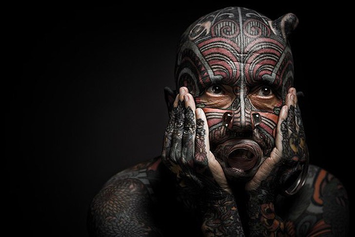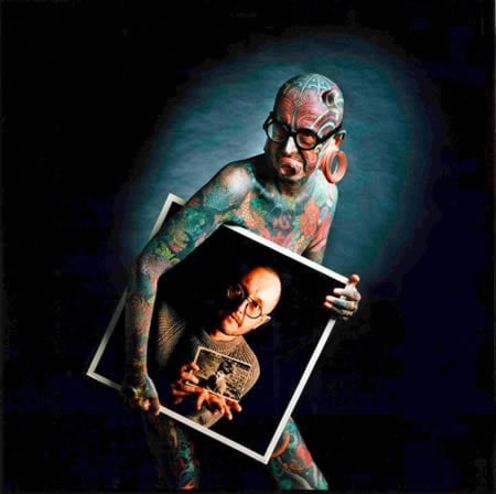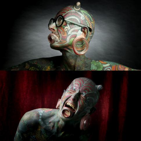 1974年獲得第一個紋身後,開啟了他的外貌改造工程,上圖為他和從前的自己合影。全身上下除了眼皮、手腳掌和肛門、生殖器周圍以外,都覆蓋了滿滿的紋身。在穿孔和植入物體的過程中,不乏細菌感染、出血不止等等令他痛苦不堪的事件,但為了達成理想外表,咬著牙就撐過來了。