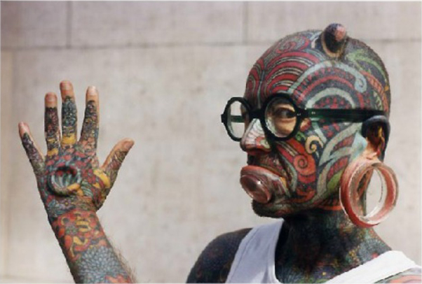 Etienne Dumont,日內瓦著名的藝術和文化評論家,全身上下滿滿的紋身藝術,包括各種巨型穿孔及人造犄角,乍看之下十分驚人,走上街頭也時時引人側目,不過對他而言,這一切不過只是在表達他的精神自由。