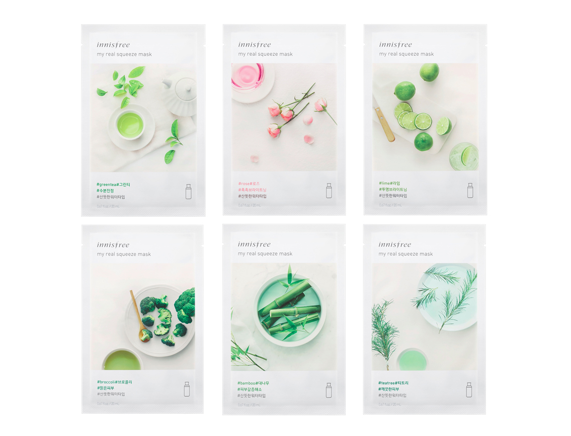 18款面膜全系列有小黃瓜、青竹、蘆薈、綠茶、盧卡蜂蜜、乳油木、紅石榴、茶樹、萊姆、玫瑰、巴西莓、禾米、花椰菜、番茄、無花果、人參、燕麥、椰子。都是以取自濟州島的綠色複合成分,包含綠茶、柑橘、仙人掌、山茶葉、蘭花為基底,不論是想要立即補水、淨化肌膚、彈潤嫩白、滋養彈力…通通有啦!
