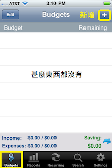 一開始進入此軟體,也許是版面設計的關係,AceBudget看起來像是一本空白的記事本,只有底下一排工具列。那麼我們就先從新增Budget開始著手吧!按右上角加號進入。