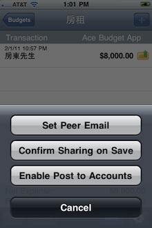 要設定同步共享很簡單,按下畫面中的Share按鍵後,會出現右下角齒輪圖案的設定圖示,Set Peer Email可以建立一個你想要共享寄送的email,Confrim Sharing on Save則是每一次你儲存紀錄時,會自動寄送email到上頭所設定的地址,若是收件者本身也有使用AceBudget,Enable Post to Accounts可以讓他/她直接從郵件中進行同步紀錄。