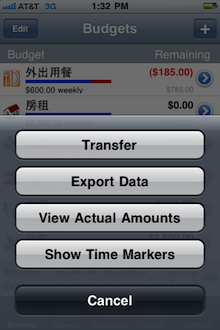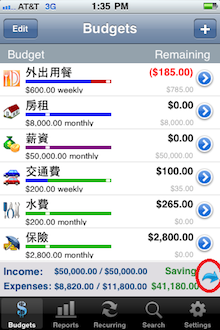 上述的兩項功能也可由主畫面中的藍色箭頭進入,Show Time Markers會在bar上顯示目前在預算周期的位置,若只是月初就已經接近紅字,那代表往後的日子可得看緊荷包了,再買就剁手指啦!