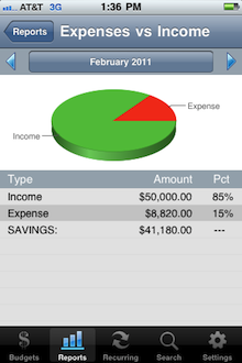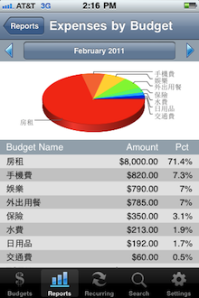 AceBudget用圓餅圖畫分每一項類別支出的比例,點選名稱可以看到詳細的支出紀錄。