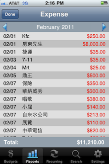 同樣的,在收支比較表中,分別點選Expense或是Income可以看到當月的詳細記錄。