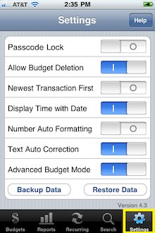 最後,使用者可以在Settings選項中Passcode Lock建立密碼,或是調整其他細部的設定。其中Number Auto Formatting是可以開啟/關閉金額小數點後兩位,在台灣的使用者就可以將此項關閉;Advanced Budget Mode則是可以同時管理收入與支出,在選擇type的時候會有income與expense兩個選項,而當此模式關閉時,則只剩下支出expense,若使用者的收入來源較簡單,建議將此關閉,輸入時就不再需要選擇type,省時也比較有效率。