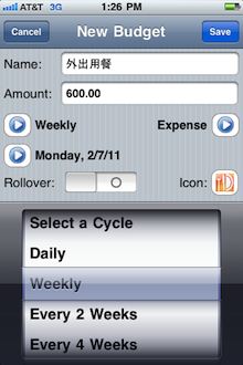預算名稱與金額打上後,可以選擇Cycle周期、Type類型、起始日、icon圖示與是否Rollover。Rollover的意思是,如果這個周期預算還有剩餘,則會自動把餘額加到下一個周期,也就是說,這個月省吃儉用可以換來下個月的情人節大餐或是周年慶的戰利品,但是正在努力存錢的使用者們,建議還是把這個功能關掉吧,畢竟能省一分是一分呀。
