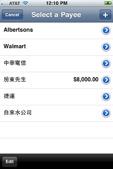 按右上角加號進行新增,在這裡”名稱”是一定要輸入的,AceBudget無法讓你選擇性的輸入,因此即使只是去巷口買個鹹酥雞,卻得連名稱都打上,有時候會有種多此一舉的感覺,輸入上的效率也因此就減低了。但若有經常使用到的付款項目,可以在Payee中建立起來。