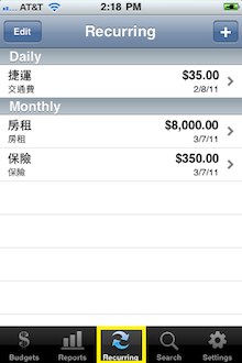 工具列中的Recurring,是可以讓使用者設定每個周期固定重複的開支或收入。像是每個月都會領的薪資,或是每天通勤的交通費,都可以逐項設定,時間一到立刻自動記錄,這樣一來就不用每次都動手輸入了。