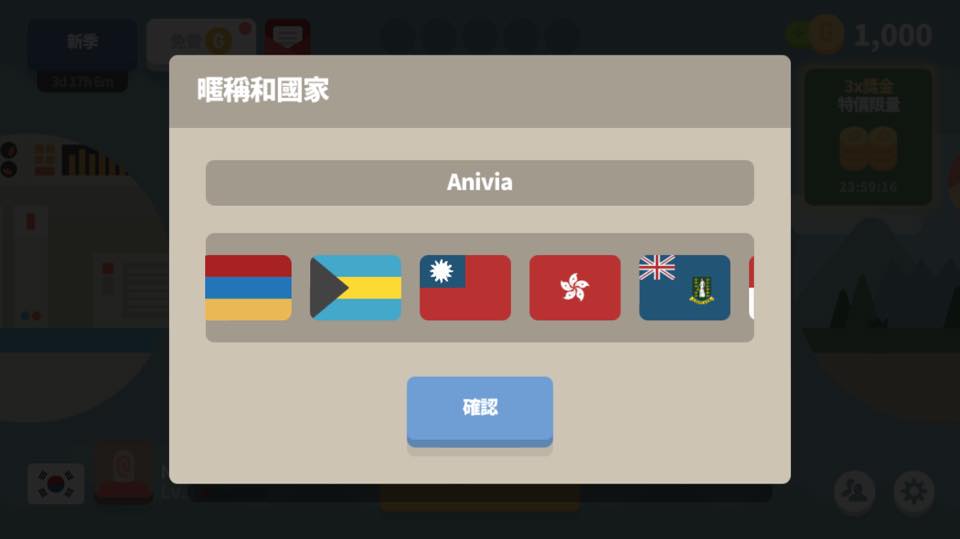 一進到遊戲畫面就要先註冊自己的國籍和姓名,揪甘心的是這遊戲有台灣國旗啊!一開始沒找到的時候手機小姐還在擔心是不是要隨便選一個...
