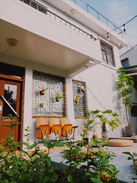 穿過綠色大門內的庭院,一整排茉莉長得特別可愛,兩層白色樓房顯得清新