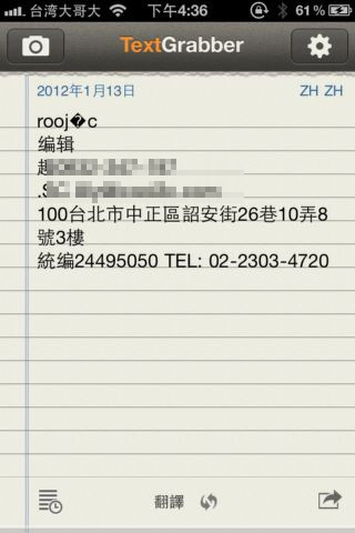 如果你手機內沒有高貴的名片辨識軟體的話,也可以讓TextGrabber +Translator暫時充當你的名片辨識工具來試試。以下就是小編的測試結果。結果發現TextGrabber +Translator辨識文字的功力算是不錯,這樣就能省下許多輸入資料的時間!但如果辨識的照片中有些圖形的話,可能就會造成辨識的錯誤囉!