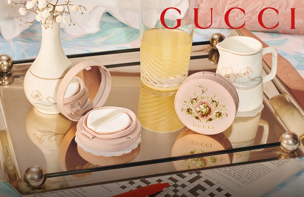GUCCI跨足美妝後首次推出氣墊粉餅!添加精油和礦物粉,拍在肌膚上會呈現光澤感妝效,淡粉紅色的圓形外盒設計,以獨特GUCCI設計裝飾,獅子周圍裝點一圈花朵,展現復古美學,非常有GUCCI的風格,外出補妝時就像隨身帶個小精品,絕對會被多看幾眼,共推出6個色選。