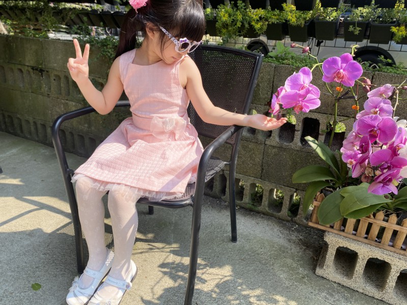 緹花款褲襪讓安安穿起來很秀氣,但因為太陽太大安安沒辦法自然的拍照,戴上太陽眼鏡才好一點。這款較薄透一點膚色,緹花設計很雅致,很適合春天秋天搭配公主裝, 當小花童或是參加party時來穿。